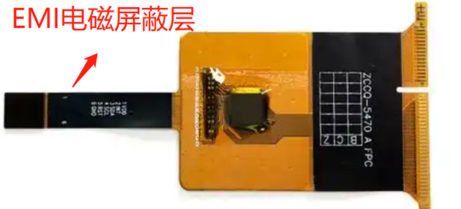 FPC軟板常用于連接主板和副板,為了保持信號(hào)傳輸過程中保持與兩個(gè)板子相同的阻抗和EMI效果,一般會(huì)在表面添加EMI電磁屏蔽層,就像在PCB中加入屏蔽罩的效果一樣,如下圖所示。