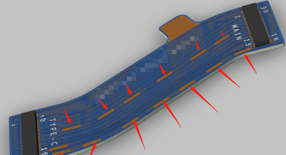 為了考慮ESD或其他需求,結(jié)構(gòu)工程師會(huì)要求在FPC上某些地方添加漏銅區(qū),如下圖所示,這些漏銅是沒有焊接需求的,所以在設(shè)計(jì)時(shí)不需要開鋼網(wǎng)。