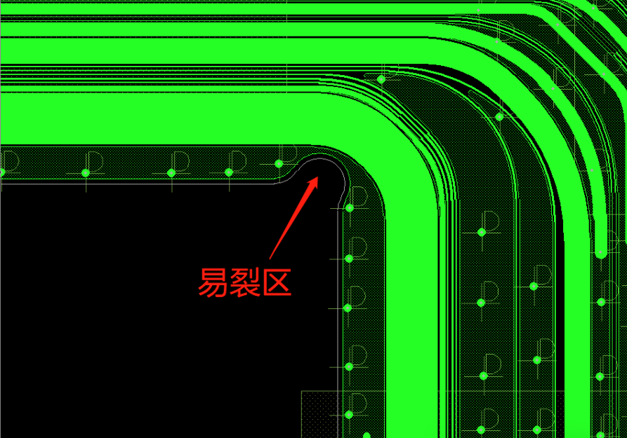 對(duì)于易裂區(qū),只有通過設(shè)計(jì)加強(qiáng)的方式來(lái)防止被撕裂了,雖然走線和板邊保持有0.2-0.3mm的距離,在易裂區(qū)內(nèi)也禁止信號(hào)線靠近板邊,板邊需要加地保護(hù)起來(lái),這樣即使被撕裂,也是這個(gè)缺口的地線被撕開了,不會(huì)影響到信號(hào),地信號(hào)整板都是,這個(gè)地方撕開了,其他途徑還可以連起來(lái)。