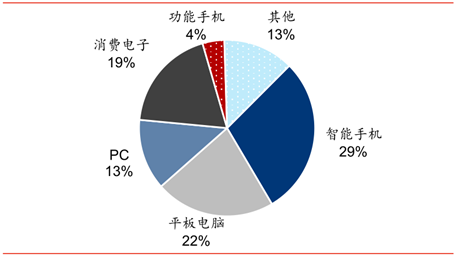 柔性電路板從應(yīng)用領(lǐng)域上看,主要用于智能手機(jī)(29%)、平板電腦(22%)、PC(13%)和消費(fèi)電子(19%)等。